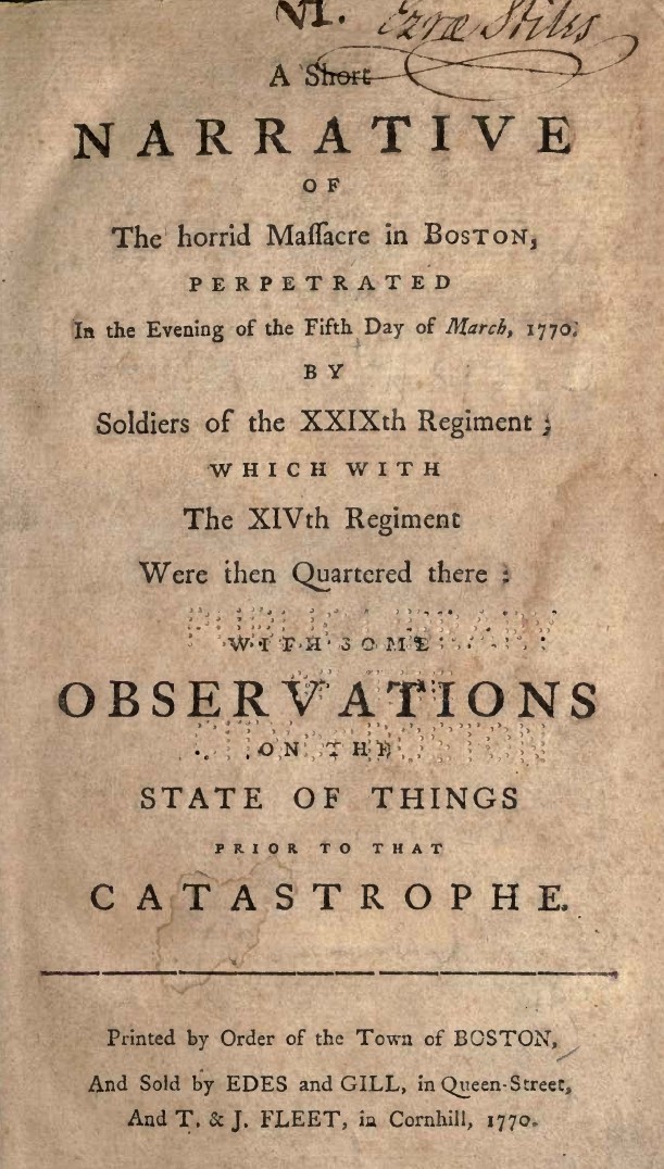 138 pages of accounts of the Boston Massacre A 1770 copy of the publishing of, “A short narrative of the horrid massacre in Boston, perpetrated in the evening of the fifth day of March, 1770. By soldiers of the XXIXth regiment; which with the XIVth regiment were then quartered there: with some observations on the state of things prior to that catastrophe.”