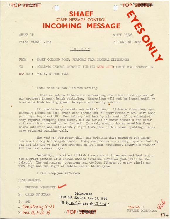 An incoming message from General Eisenhower to General Marshall discussed the initial reports of the Normandy landing on June 6, 1944.