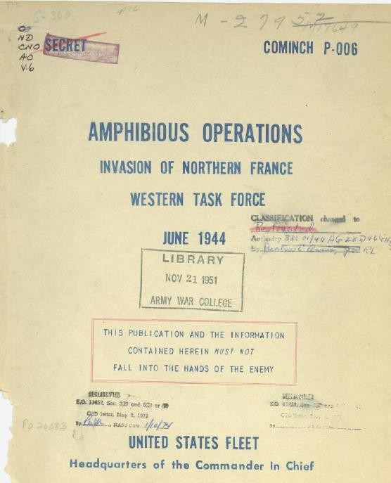 A report detailing the amphibious operations for the invasion of Northern France by the Western Task Force of the United States Fleet was produced in June 1944.
