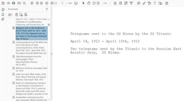 This collection contains documents related to the Titanic, preserved in the British National Archives. It includes 8,825 pages of archival material covering various aspects of the Titanic’s history. The collection of information encompasses a wide range of documents and records related to the Titanic tragedy. It includes a compilation passengers who were embarking on their journey at both Queenstown and Southampton, as well as detailed lists of crew members and passengers aboard the ship. Additionally, there are records of those who were lost in the disaster. The documentation further comprises the registration papers for the Titanic, communications from the British Foreign Office concerning the incident, and various correspondences and memorandums from the British Board of Trade’s Marine Department.